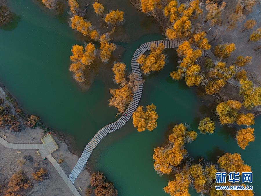 這是在內(nèi)蒙古自治區(qū)額濟(jì)納旗拍攝的胡楊林(10月10日無(wú)人機(jī)拍攝)。 金秋時(shí)節(jié),內(nèi)蒙古自治區(qū)額濟(jì)納旗胡楊林如同披上金裝,成為大漠中的一抹亮色,吸引眾多中外游客前來(lái)觀(guān)賞游玩。 新華社記者劉磊攝