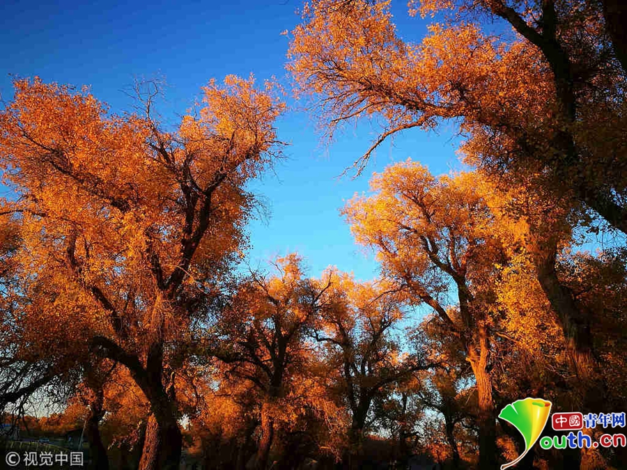 大片的胡楊樹葉由綠變黃,一眼望去,陽(yáng)光下金色的樹葉襯著湛藍(lán)的天空于風(fēng)中婆娑起舞。