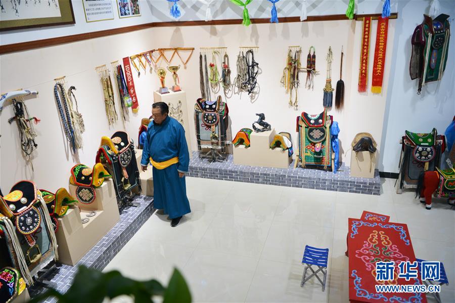 10月31日,在內(nèi)蒙古自治區(qū)通遼市市區(qū),套格敦白乙走過(guò)工作室一樓的展廳。新華社記者鄒予攝