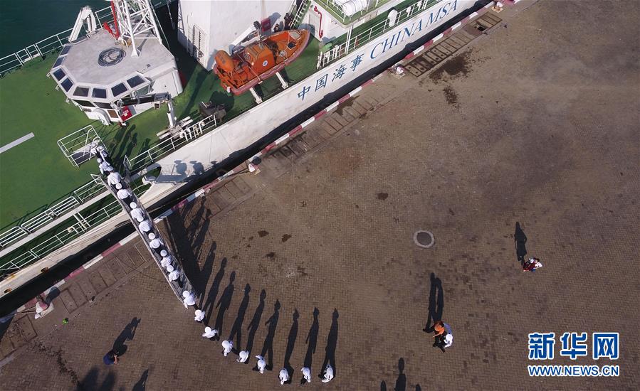 11月3日,海事執(zhí)法人員登上“海巡21”輪(無(wú)人機(jī)拍攝)。當(dāng)日,隨著“海巡21”輪緩緩駛離海口海事監(jiān)管基地碼頭,由瓊桂粵海事部門(mén)共同開(kāi)展的瓊州海峽、北部灣及環(huán)海南島水域跨轄區(qū)聯(lián)合巡航執(zhí)法活動(dòng)揭開(kāi)序幕。新華社記者楊冠宇攝