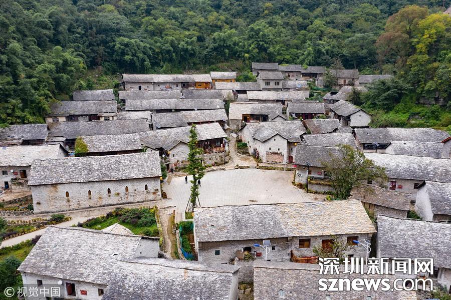 深圳新聞網(wǎng)訊 2018年9月27日,貴州安順,航拍坐落在群山中的鎮(zhèn)寧布依族苗族自治縣高蕩村。鎮(zhèn)寧高蕩村民居為石木結(jié)構(gòu)干欄式石板房,建造時間五、六十年至數(shù)百年不等,建筑保存基本完好。