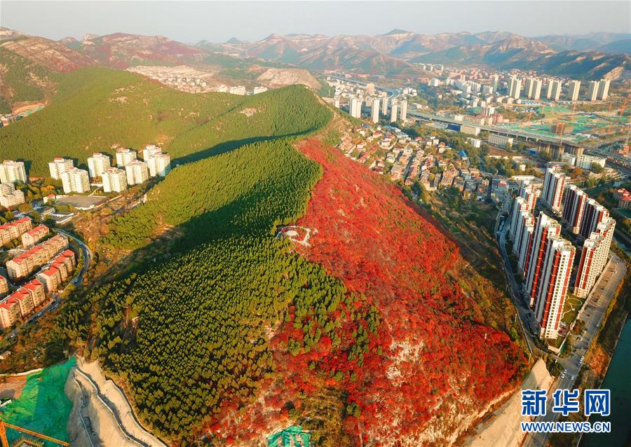 深秋時節(jié),山東濟南楔子山山脊兩邊種植的植被形成“一山雙色”景觀,令人稱奇。