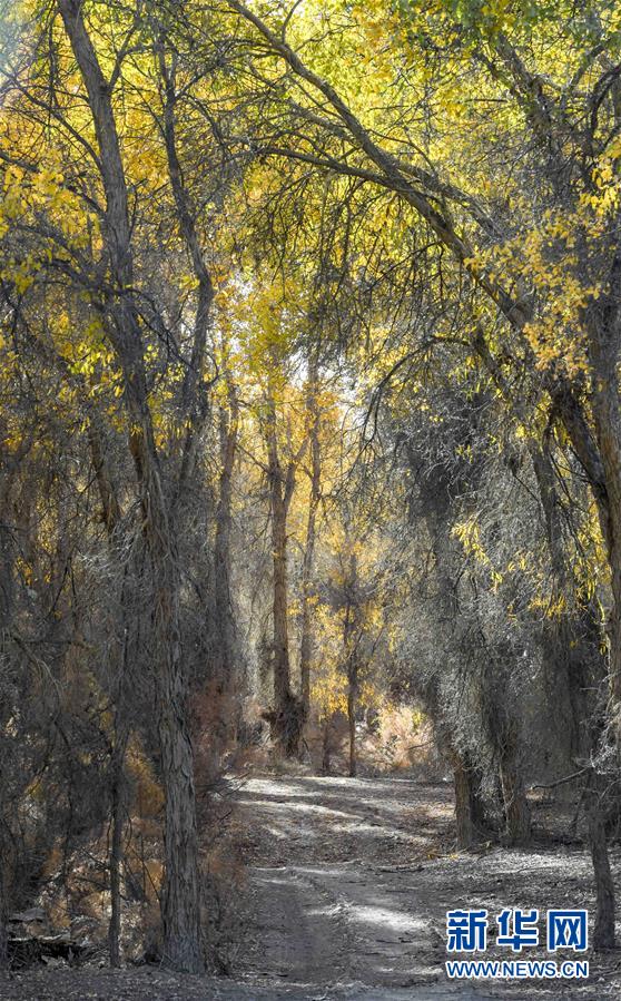 新疆輪臺縣胡楊林深處的一條小路(10月25日攝)。 10月中下旬,靜靜的塔里木河中下游一片金黃。胡楊深處,條條小路蜿蜒綿長通向遠方,引人入勝。 塔里木河是中國最長的內(nèi)陸河,這一區(qū)域原始胡楊林分布較為集中。隨著塔里木河連續(xù)19次向下游生態(tài)輸水,為胡楊林“解渴”,塔河兩岸生態(tài)得到明顯改善,沙地面積逐年減少。 新華社記者趙戈攝