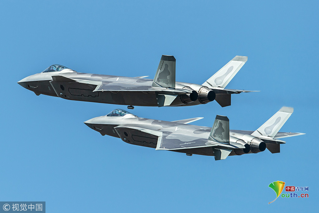 圖二:2018年11月6日,廣東珠海航展上,兩架殲-20戰(zhàn)機組成雙機編隊進行飛行表演。