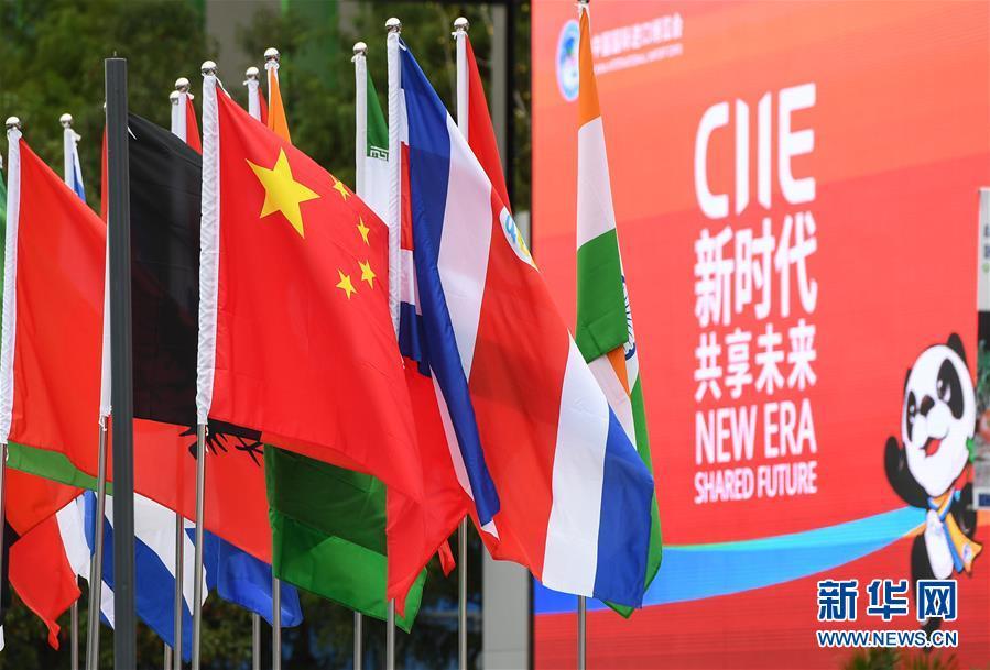 11月5日,在上海國家會(huì)展中心入口處,旗幟迎風(fēng)飄揚(yáng)。新華社記者 李賀 攝