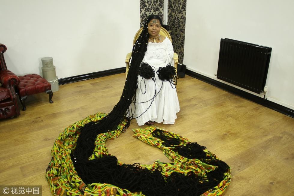她的頭發(fā)現(xiàn)在長(zhǎng)約34米(110英尺),超過(guò)三輛雙層巴士的長(zhǎng)度。Asha Mandela十年前打破了世界吉尼斯頭發(fā)最長(zhǎng)的記錄。