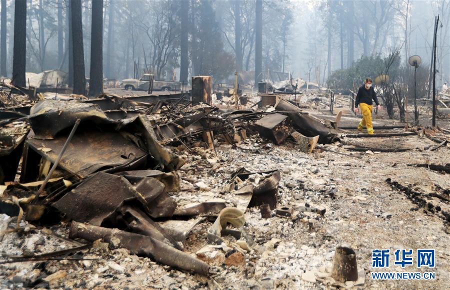 11月18日,在美國加利福尼亞州比尤特縣天堂鎮(zhèn),一名消防人員查看廢墟。 新華社記者吳曉凌攝