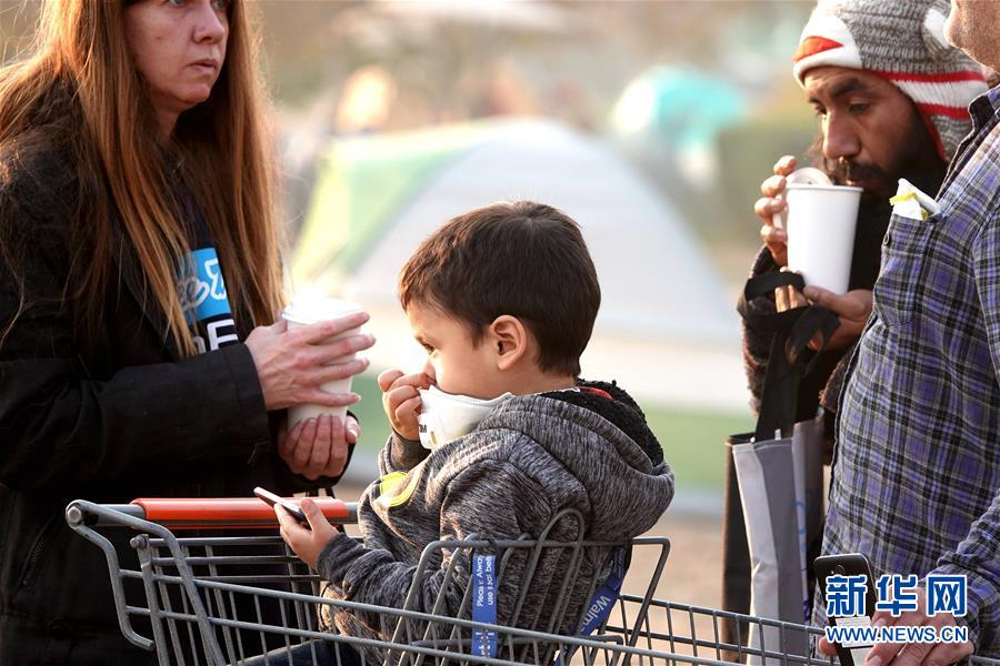 11月18日,在美國加利福尼亞州比尤特縣奇科,災(zāi)民在沃爾瑪停車場搭起帳篷暫居。 新華社記者吳曉凌攝