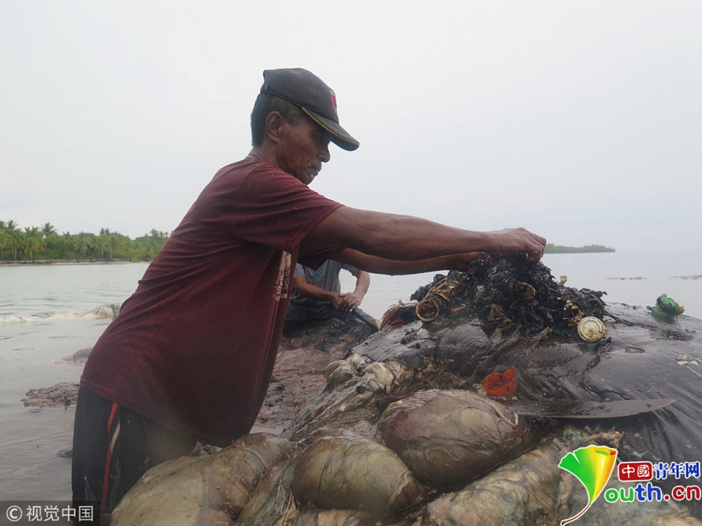 當?shù)貢r間2018年11月19日,印尼瓦卡托比,當?shù)匕l(fā)現(xiàn)一頭擱淺的鯨,肚子里滿是塑料垃圾。它的腹中有12斤塑料垃圾,其中包括115個杯子。