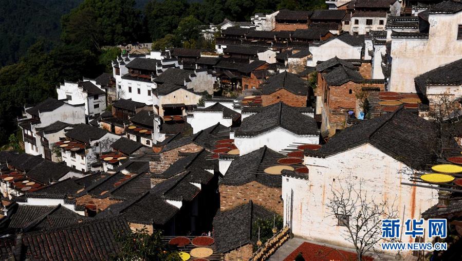 2017年10月26日拍攝的篁嶺古村。家家戶戶晾曬各種蔬果及皇菊。近日天氣晴朗,江西省婺源縣江灣鎮(zhèn)篁嶺村村民抓住時(shí)機(jī)采摘、晾曬皇菊及蔬果。明黃的菊花、火紅的辣椒……各種顏色將篁嶺古村裝扮成巨大的“調(diào)色板”,引來眾多游客感受鄉(xiāng)村美景。新華社記者宋振平 攝