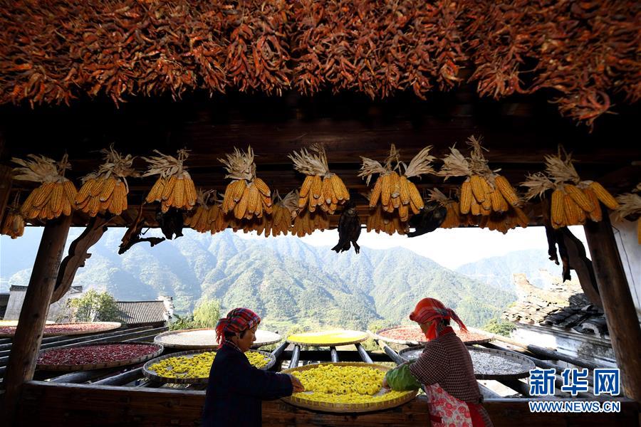 2017年10月26日,篁嶺村村民在晾曬皇菊。近日天氣晴朗,江西省婺源縣江灣鎮(zhèn)篁嶺村村民抓住時(shí)機(jī)采摘、晾曬皇菊及蔬果。明黃的菊花、火紅的辣椒……各種顏色將篁嶺古村裝扮成巨大的“調(diào)色板”,引來眾多游客感受鄉(xiāng)村美景。新華社記者宋振平 攝