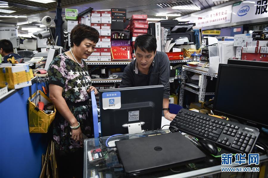 倪海真(左)到深圳華強北賽格電子市場五層的支部宣傳委員陳亞林柜臺前,與他溝通近期支部黨員學習的情況(2017年9月5日攝)。新華社記者毛思倩 攝 圖片來源:新華網(wǎng)