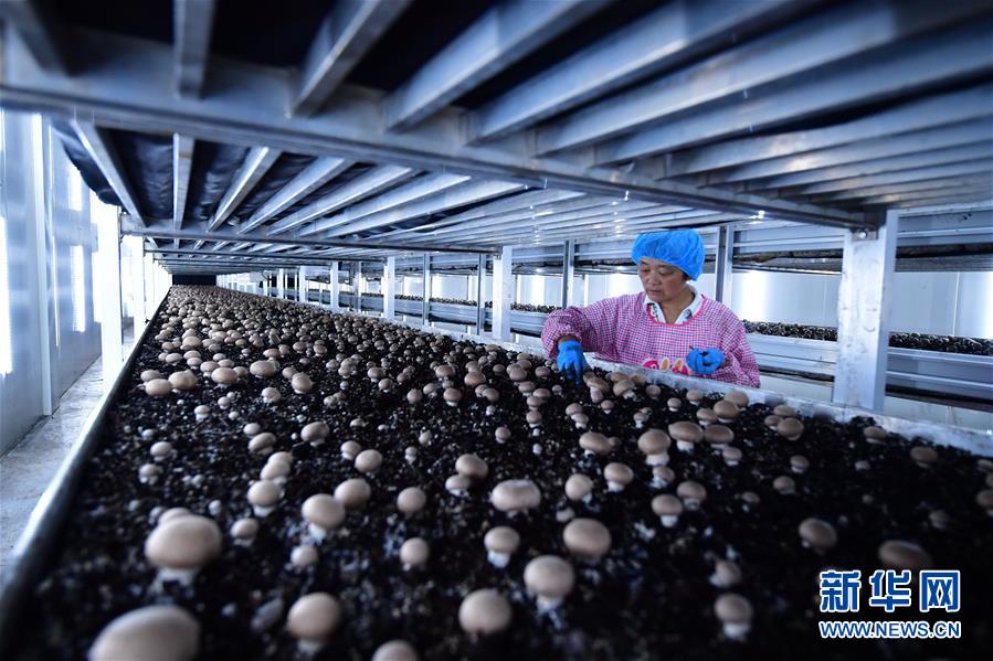 在河南蘭考縣東壩頭鄉(xiāng)張莊村,一位村民正在一個(gè)食用菌企業(yè)的車間內(nèi)采摘褐蘑菇(6月21日攝)。新華社記者馮大鵬攝