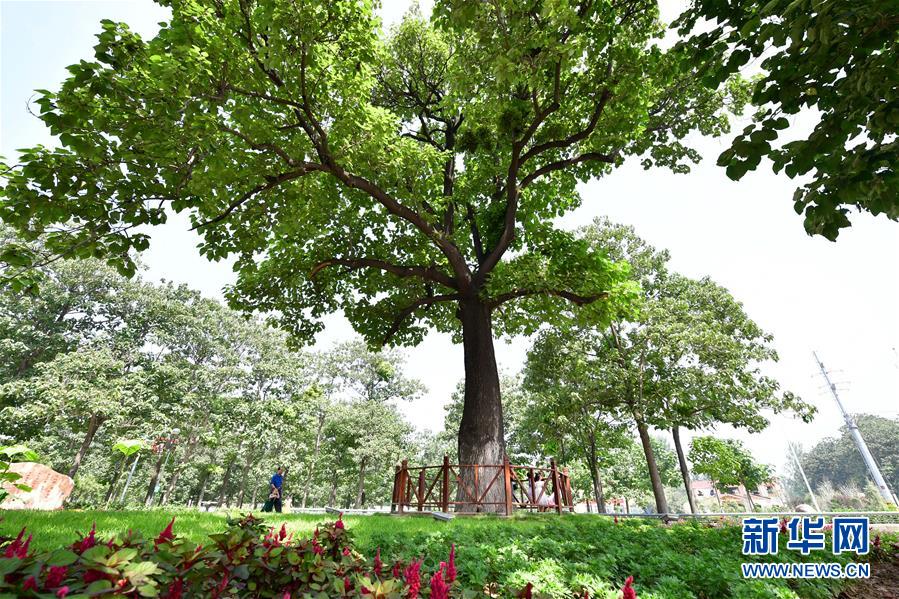 在河南蘭考縣焦裕祿干部學(xué)院門口,游客從“焦桐”下走過(guò)(2017年8月9日攝)。新華社記者馮大鵬攝