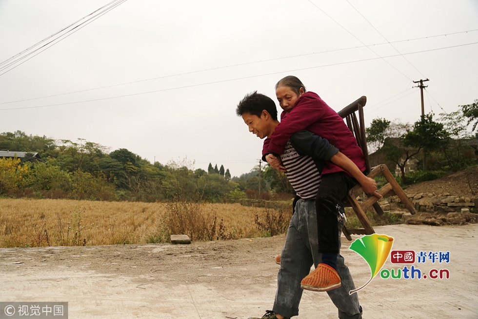 37歲的王顯強(qiáng),家在重慶市綦江區(qū)永新鎮(zhèn)伏牛村。23年前,王顯強(qiáng)的母親田井貴意外摔倒導(dǎo)致全身癱瘓,吃喝拉撒全由王顯強(qiáng)的父親照顧。2003年,王顯強(qiáng)的父親去世,深受打擊的田井貴從此開(kāi)始不再和外人說(shuō)話?!拔覌尵褪俏业娜浚 痹驹谡憬蚬さ耐躏@強(qiáng)回到家里,為了養(yǎng)活自己和母親,他決定背著母親到重慶主城打工。從此,身材不高的王顯強(qiáng),用自己不算厚實(shí)的后背,讓母親有了新的依靠。