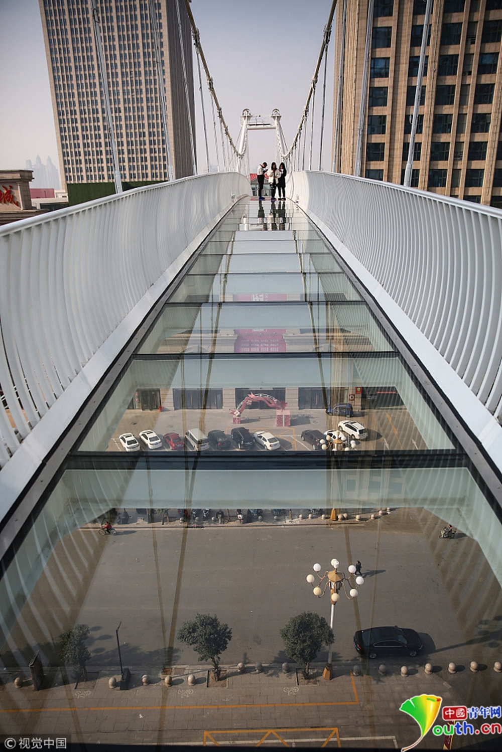 2018年11月28日,石家莊市區(qū)內(nèi)的一座玻璃吊橋在網(wǎng)絡(luò)上走紅,游客們置身于透明的玻璃吊橋上,望著地面川流不息的車輛,伴隨玻璃破裂的特效聲,不禁膽戰(zhàn)心驚。這座玻璃吊橋位于石家莊南二環(huán)附近,橋體橫跨塔通大街,長100米,高30米,。橋面由52塊特質(zhì)玻璃構(gòu)成,其中4塊為特效玻璃,游客腳踩上去就會發(fā)出玻璃破裂的聲音。