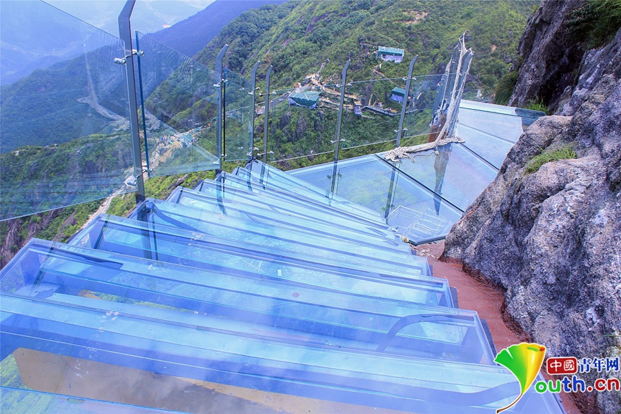 2018年8月,廣東清遠。如今,玻璃橋、玻璃觀景臺、玻璃漂流道、玻璃滑道等玻璃產(chǎn)品可以說多如牛毛,琳瑯滿目。這些玻璃產(chǎn)品都是水平的,即使有坡度,也是借助工具滑下去的。小伙伴們是否挑戰(zhàn)體驗過像樓梯一樣的玻璃天梯,階梯式攀向高處,直聳云宵,云霧飄渺。