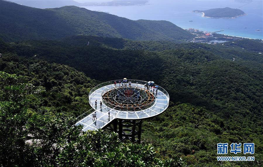 8月31日,游客在玻璃棧道上參觀游覽。近日,位于海南省三亞市亞龍灣熱帶天堂森林公園的大佛石全海景玻璃棧道開始正式營業(yè)。凌空而建的玻璃棧道全長400米,游客可將亞龍灣的美景盡收眼底。新華社記者郭程攝