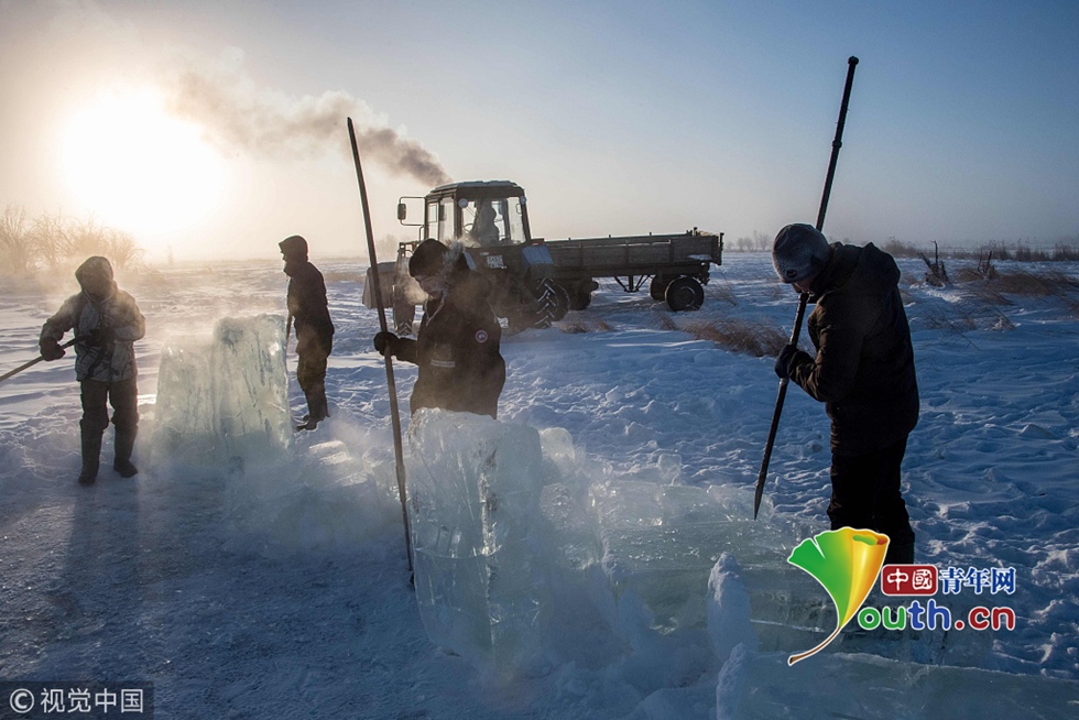 當?shù)貢r間2018年11月27日,雅庫茨克,零下41攝氏度左右的氣溫下,村民在當?shù)氐囊粋€湖中采集冰塊。當?shù)睾芏嗳艘蕾囉谌诨鶋K解決供水,因為多年凍土覆蓋地區(qū)冬季氣溫極低,沒有其他的方式供應水。