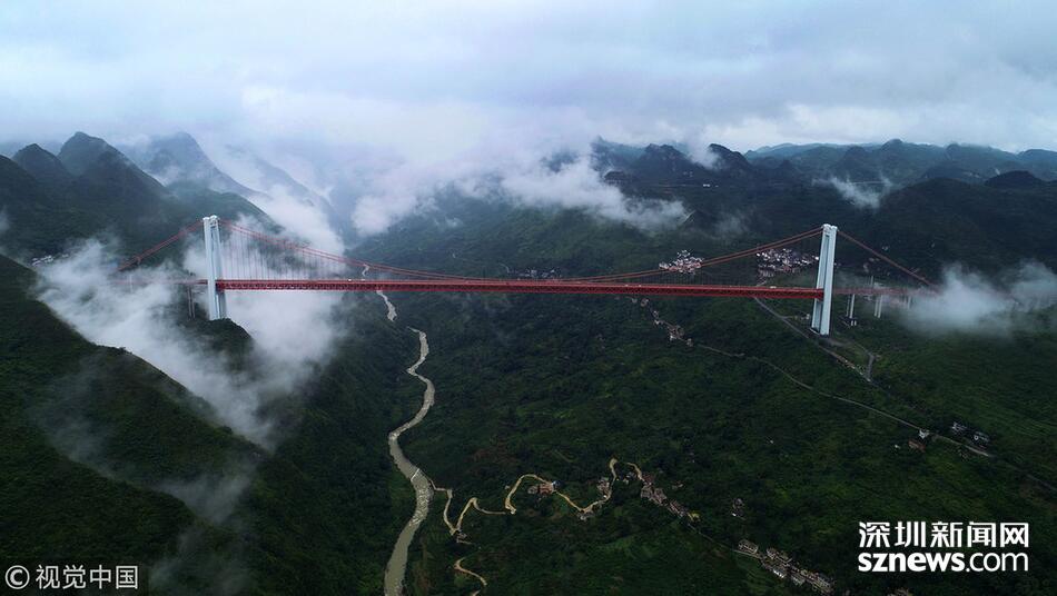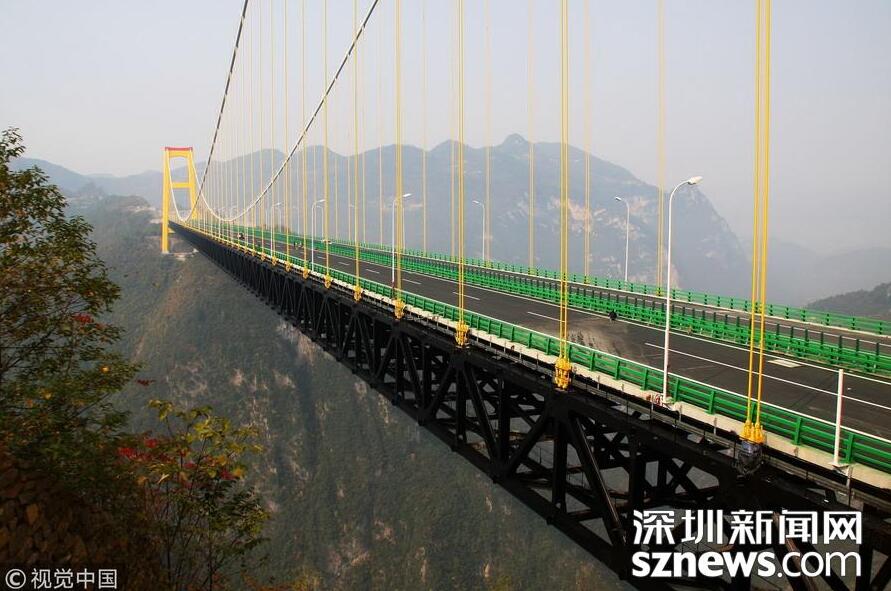 【世界第一高懸索橋——四渡河大橋】四渡河特大橋位于巴東縣野三關鎮(zhèn)四渡河,大橋主跨900米,橋面與峽谷谷底高差達560米,相當于200層樓高,是目前國內(nèi)在深山峽谷里修建的最大跨度懸索橋,比目前世界最高橋法國米約大橋還要高290米,被譽為世界第一高懸索橋。