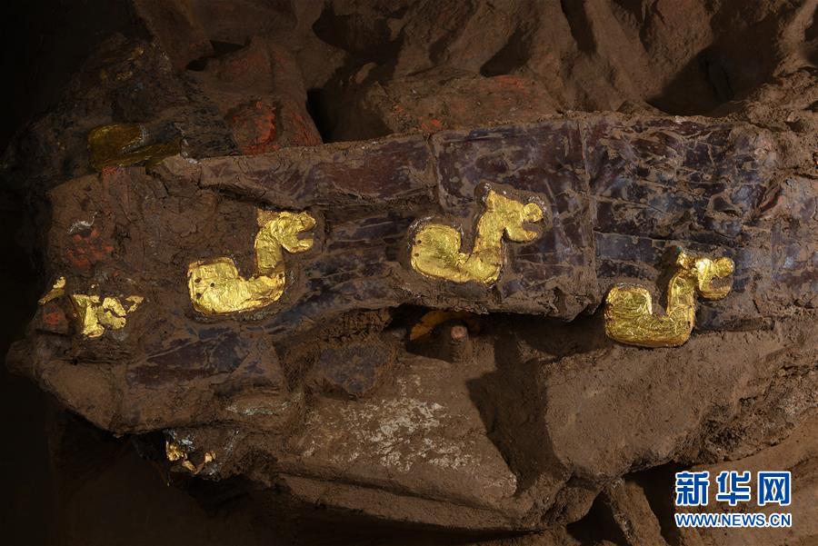 這是在位于河北行唐的考古實(shí)驗(yàn)室內(nèi)拍攝的局部車(chē)廂上鑲嵌有成組對(duì)稱(chēng)的貼有金箔飾片的金屬質(zhì)獸型牌飾(12月4日攝)。新華社記者 李賀 攝