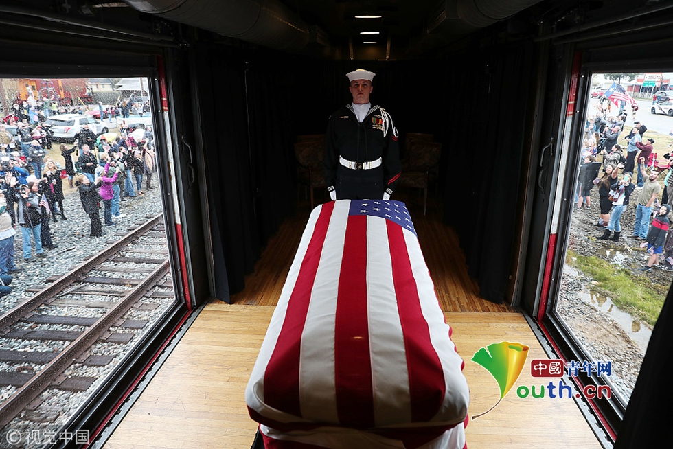 當(dāng)?shù)貢r(shí)間2018年12月6日,美國德州,美國前總統(tǒng)老布什將落葬德州農(nóng)機(jī)大學(xué)布什總統(tǒng)圖書館和博物館后面的布什家族墓地,與他半年前去世的妻子芭芭拉以及早夭的女兒蘿賓葬在一起。當(dāng)天,一輛葬禮專列將載著老布什的棺槨及其親朋,從休斯敦郊區(qū)開往老布什的最后安葬之地、德州農(nóng)機(jī)大學(xué)。這列火車的第六節(jié)車廂側(cè)面是透明的,人們可以在鐵軌旁看到老布什蓋著國旗的靈樞。圖片作者:Joe Raedle/視覺中國