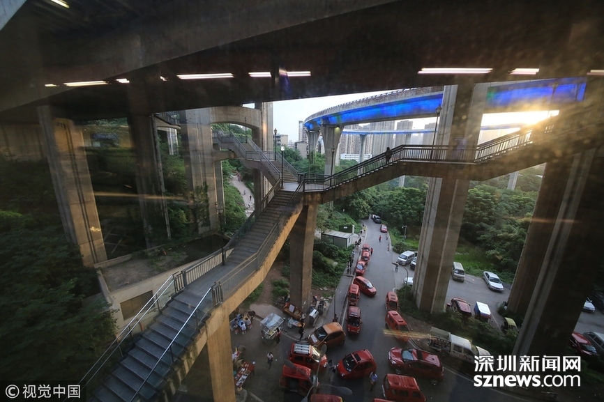 2018年5月29日,重慶,魔幻重慶又雙叒叕放大招!還有一個(gè)獨(dú)特的亮點(diǎn),重慶軌道交通3號(hào)線銅元局站,出口由一段長梯銜接上方立交橋和下方的路面,與全國最高城市立交橋蘇家壩立交組成了獨(dú)特風(fēng)景,許多游客專門趕來拍照。