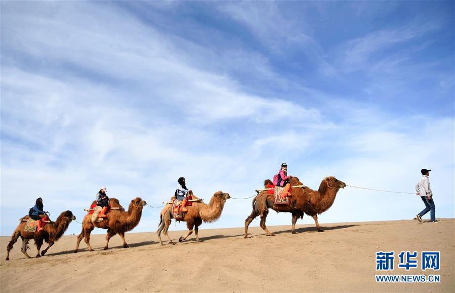 游客在敦煌鳴沙山騎駱駝(2017年5月3日攝)。 敦煌記錄歷史。開放的胸襟,曾讓這里成為古代絲綢之路上“華戎所交一都會”。 時隔千年,改革開放的春風吹入西北內陸小城,敦煌再度成為中國對外開放的文化前沿。 新華社記者 陳斌 攝