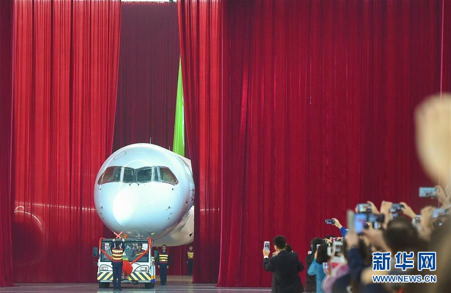 我國自主研制的C919大型客機首架機,在中國商飛公司總裝制造中心浦東基地廠房內正式下線(2015年11月2日攝)。新華社發(fā)(裴鑫攝)