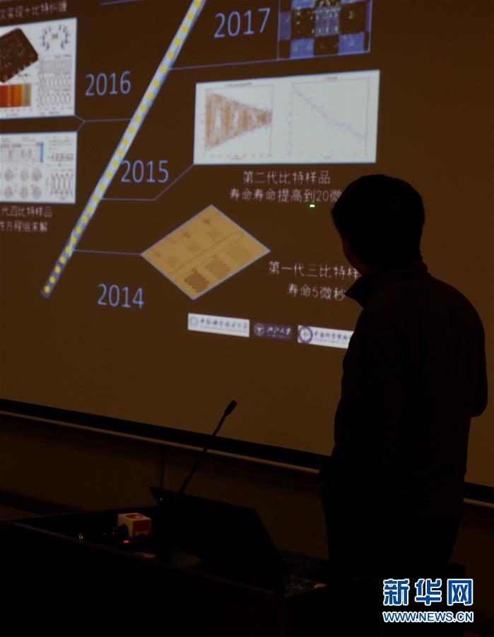 2017年5月3日,中國科學技術大學潘建偉院士在上海宣布,我國科研團隊成功構建的光量子計算機,首次演示了超越早期經典計算機的量子計算能力。這是潘建偉院士在介紹“超導量子計算機路線圖”。 新華社記者 金立旺攝