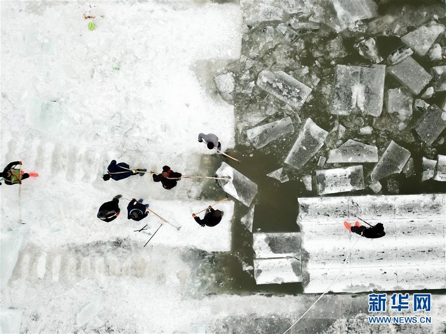 在松花江哈爾濱段江面,工人們在進行切割和采冰工作(12月12日無人機拍攝)。 黑龍江哈爾濱市的冰雪主題樂園哈爾濱冰雪大世界的采冰和建設工作近日拉開帷幕。為保證足夠的優(yōu)質冰供給,每天有近千名采冰人和700多輛運冰車參與到采冰工作。 新華社記者 王松 攝