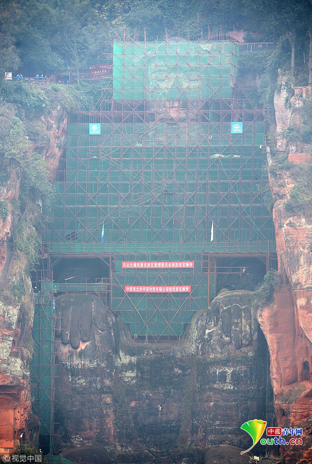 據(jù)大佛體檢項目負責(zé)人、中鐵西北科學(xué)研究院文保中心副主任孫博介紹說:主要是前期修繕材料出現(xiàn)耐久性問題,造成胸腹部起鼓、開裂、剝落。因為大佛主體結(jié)構(gòu)從上到下整體是砂巖結(jié)構(gòu),但不同的砂巖層之間又有30厘米至50厘米厚的泥巖夾層,泥巖則相對較弱,那么泥巖夾層就變成了相對的隔水層。