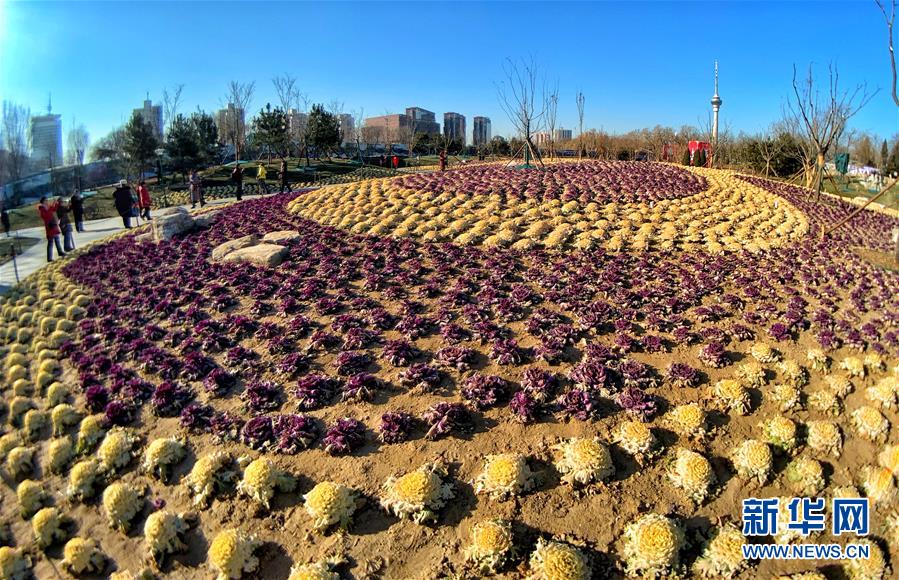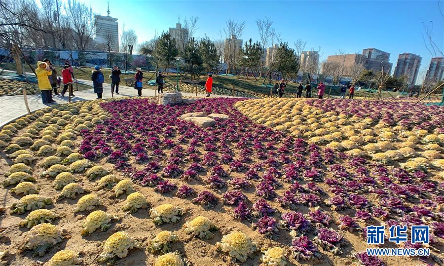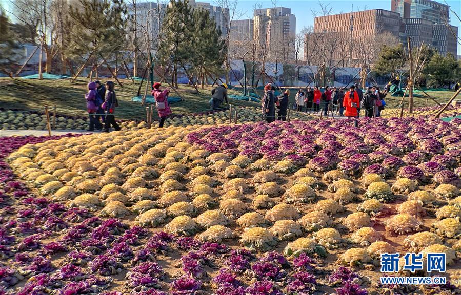 12月24日,游人在北京玉淵潭公園觀賞甘藍(lán)。 日前,北京市玉淵潭公園移栽的三萬(wàn)多棵紫色和黃色羽衣甘藍(lán)盛開(kāi),為冬季公園增添了色彩。 新華社記者李欣攝
