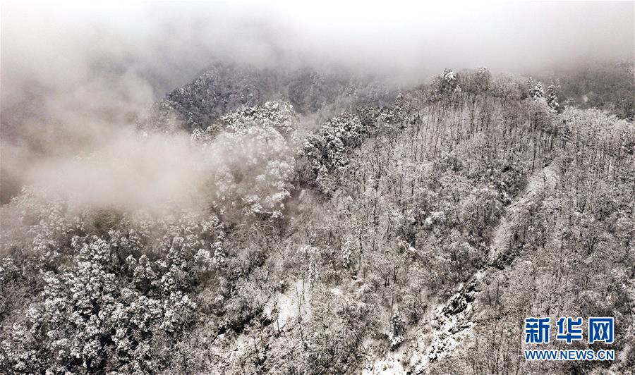 云霧中的鬼谷嶺國家森林公園山頂白雪皚皚,山腰秋色正濃(11月8日無人機(jī)拍攝)。 新華社記者陶明攝