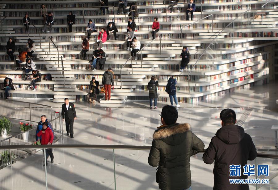 12月27日,讀者參觀天津?yàn)I海新區(qū)圖書(shū)館中庭。 濱海新區(qū)圖書(shū)館位于天津?yàn)I海文化中心,2017年10月1日正式開(kāi)館,設(shè)計(jì)立意為“濱海之眼”和“書(shū)山有路勤為徑”。圖書(shū)館現(xiàn)有藏書(shū)60多萬(wàn)冊(cè),一年多來(lái)接待讀者約280萬(wàn)人次,已成為濱海新區(qū)的文化“新地標(biāo)”。 新華社記者段卓力攝
