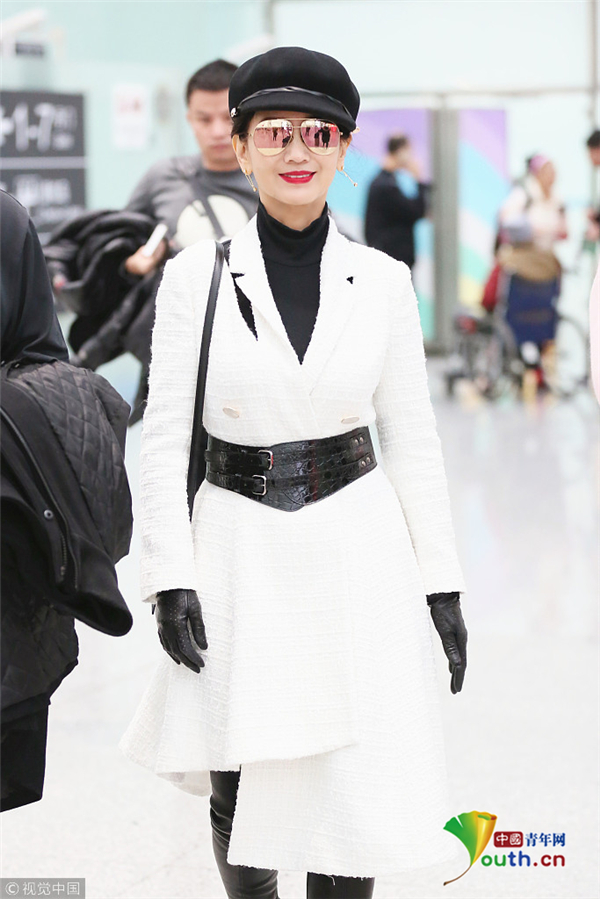 1月10日,廣東省深圳市,趙雅芝夫婦現(xiàn)身深圳寶安機場,頭戴貝雷帽的她架著反光墨鏡,一襲白色不規(guī)則連衣裙配上黑色腰封及皮靴,酷似甜美女教官!