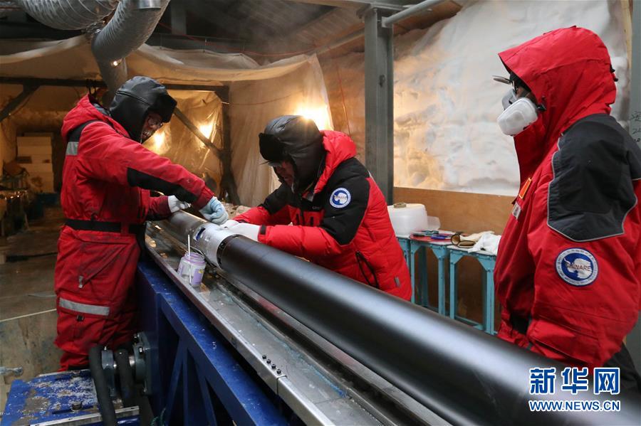 科考隊(duì)員處理鉆取的2.8米長冰芯(1月12日攝)。 新華社記者 劉詩平 攝