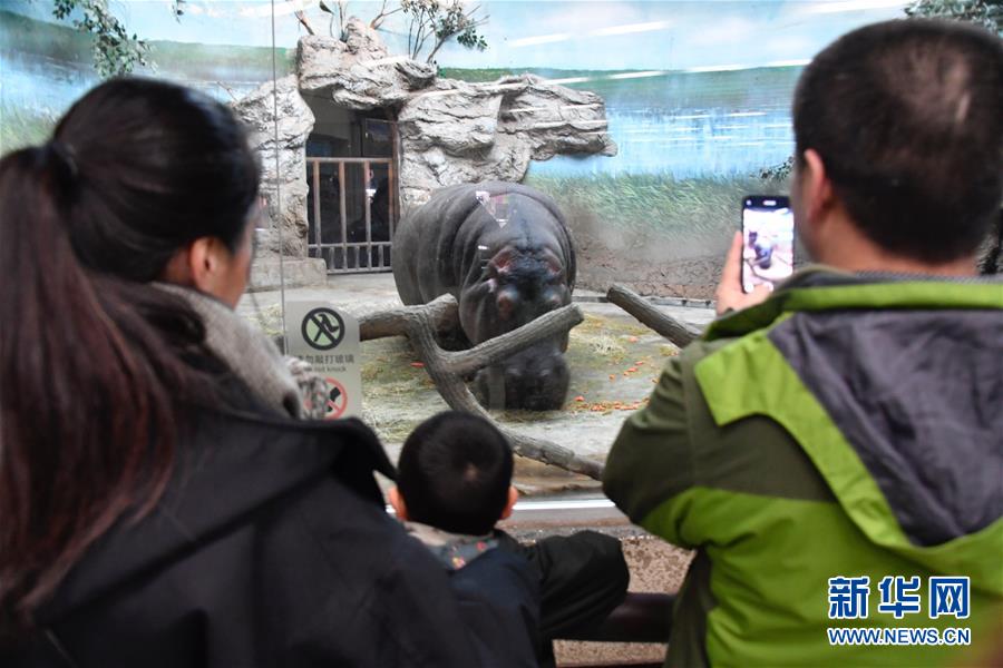 1月13日,游客在北京動(dòng)物園恒溫的河馬館內(nèi)觀賞河馬。