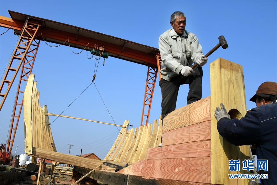 在青島紅雙木造船廠,幾位造船師傅在安裝船肋骨(1月10日攝)。新華社記者 李紫恒 攝
