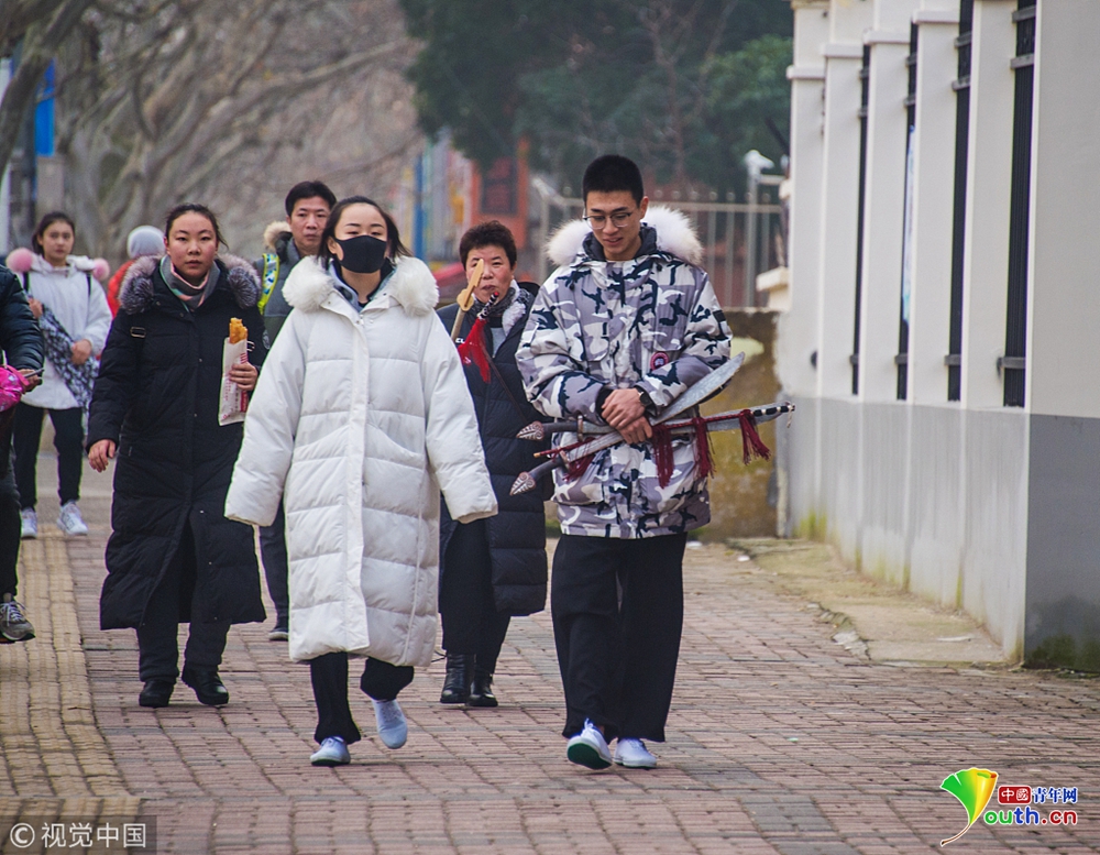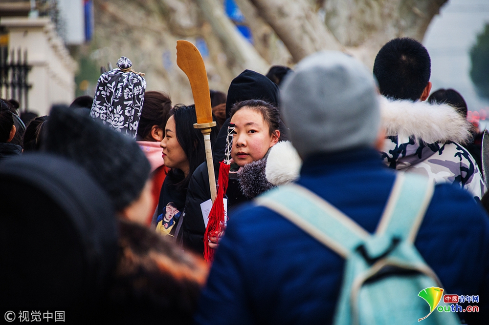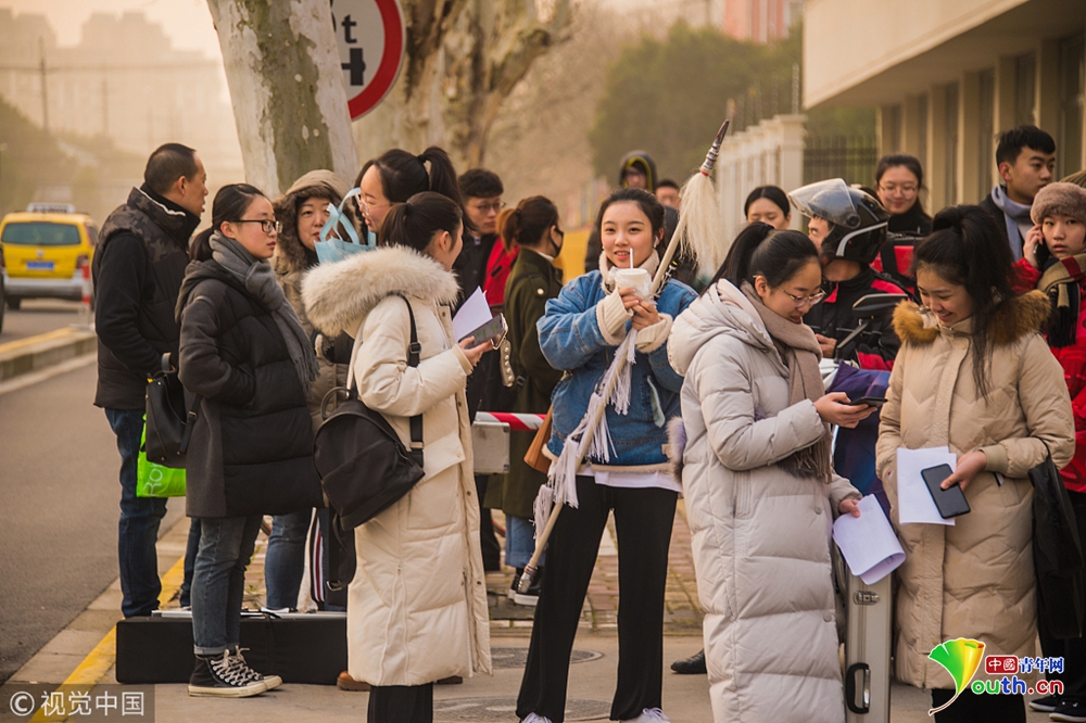 2019年1月14日,上海,上戲“藝考”第一階段第一天,不少考生從全國各地趕來,有的帶著樂器,有的帶著“刀槍”,在考點(diǎn)門口候考時(shí),還不時(shí)地練習(xí)下。