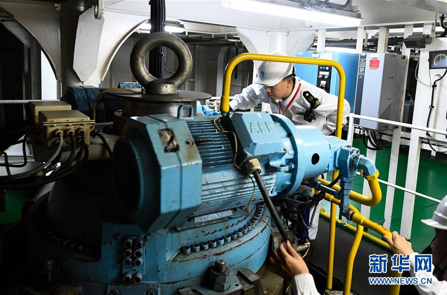 1月15日,??诤J戮止ぷ魅藛T在粵海鐵4號(hào)客滾船的機(jī)艙內(nèi)檢查舵機(jī)。