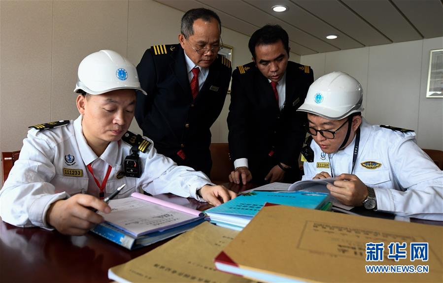 1月15日,海口海事局工作人員在粵海鐵4號客滾船上檢查文書文件。 新華社記者 楊冠宇 攝