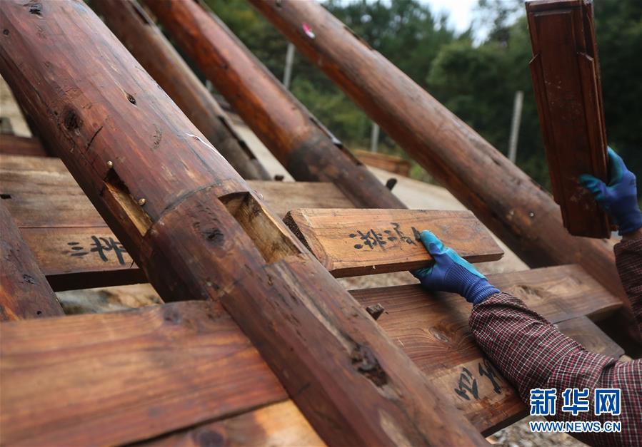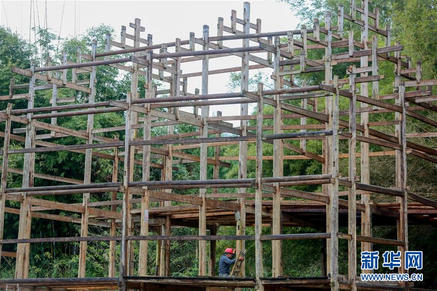 1月15日,在廣西融水苗族自治縣融水鎮(zhèn)夢嗚苗寨,一名工人將苗族吊腳樓的主要結(jié)構(gòu)進行“復原”安裝。新華社記者 陳君清 攝
