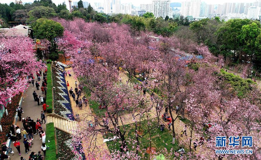 游人在昆明圓通山公園觀賞盛開的櫻花(3月16日無人機(jī)拍攝)。近日,云南省昆明市迎來櫻花盛開的時(shí)節(jié)。昆明圓通山公園的數(shù)千株櫻花燦爛綻放,吸引了市民和游客前來觀花賞景。新華社記者秦晴攝