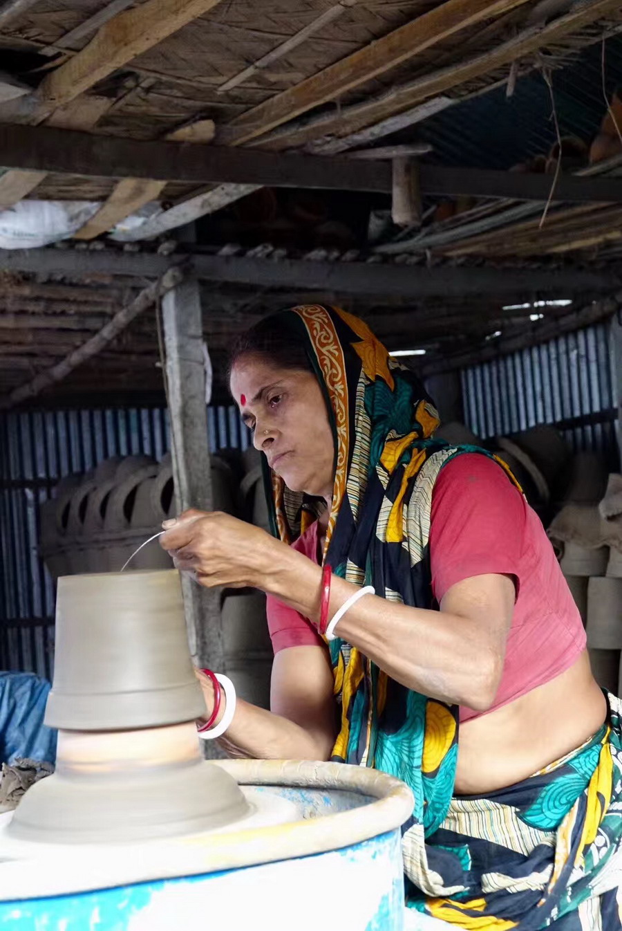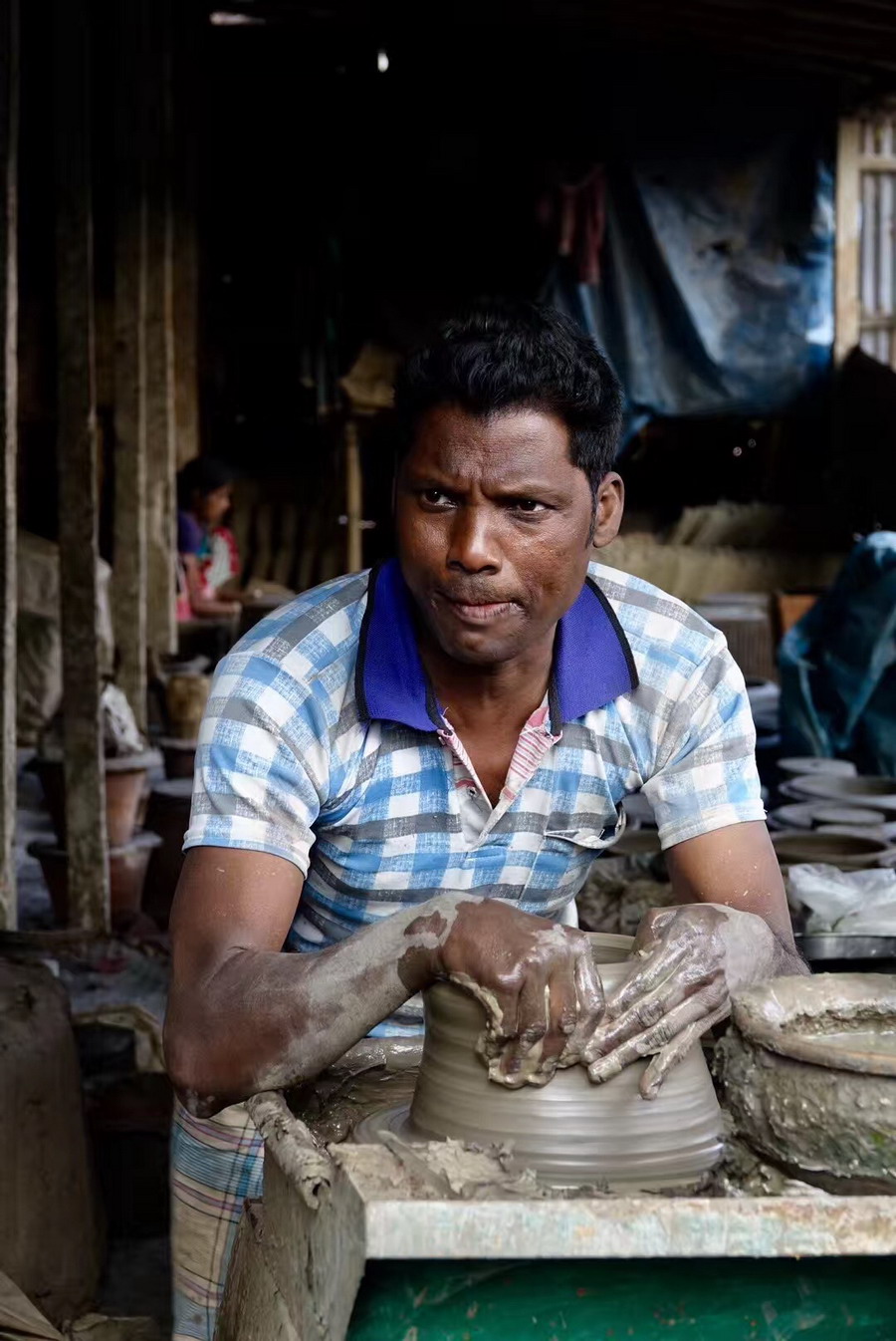 達(dá)卡遠(yuǎn)郊區(qū)一個(gè)印度教徒聚居的村莊,幾乎家家戶戶都開辦制陶作坊,以傳統(tǒng)工藝制作陶盆、陶罐、陶盤和建筑裝飾陶器,遠(yuǎn)銷孟加拉國內(nèi)各地。李仁奇 攝