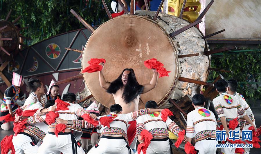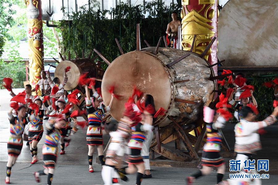 基諾族演員在表演大鼓舞(6月1日攝)。 在云南省西雙版納傣族自治州景洪市基諾山基諾族鄉(xiāng)的基諾族村寨,每天的基諾大鼓舞表演吸引了眾多游客前來觀賞體驗(yàn),帶動(dòng)了基諾族群眾就業(yè)和增收?;Z族大鼓舞蘊(yùn)涵豐富的歷史文化內(nèi)涵,已被列入國(guó)家級(jí)非物質(zhì)文化遺產(chǎn)保護(hù)名錄。 新華社記者 楊宗友 攝