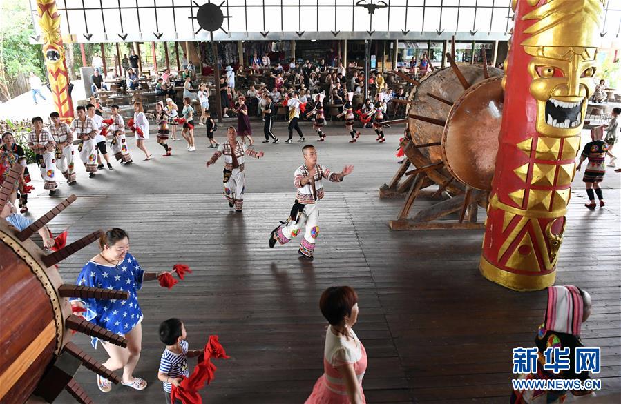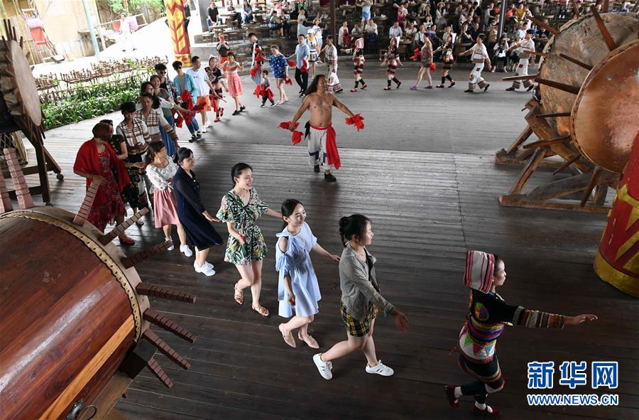 游客與基諾族大鼓舞演員一起跳舞(6月1日攝)。 在云南省西雙版納傣族自治州景洪市基諾山基諾族鄉(xiāng)的基諾族村寨,每天的基諾大鼓舞表演吸引了眾多游客前來觀賞體驗(yàn),帶動(dòng)了基諾族群眾就業(yè)和增收?;Z族大鼓舞蘊(yùn)涵豐富的歷史文化內(nèi)涵,已被列入國(guó)家級(jí)非物質(zhì)文化遺產(chǎn)保護(hù)名錄。 新華社記者 楊宗友 攝