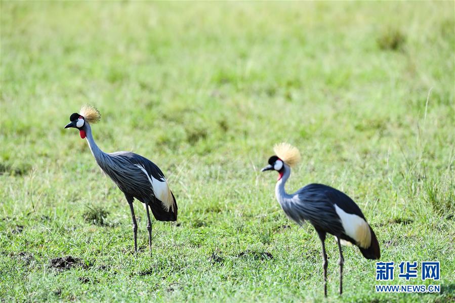 6月17日,在肯尼亞馬賽馬拉國家保護(hù)區(qū),兩只冕鶴在草原上覓食。 新華社記者 李琰 攝