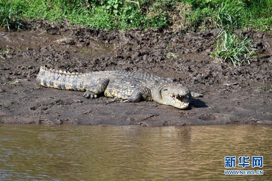 6月17日,在肯尼亞馬賽馬拉國家保護(hù)區(qū),一條鱷魚在水邊休息。  新華社記者 李琰 攝