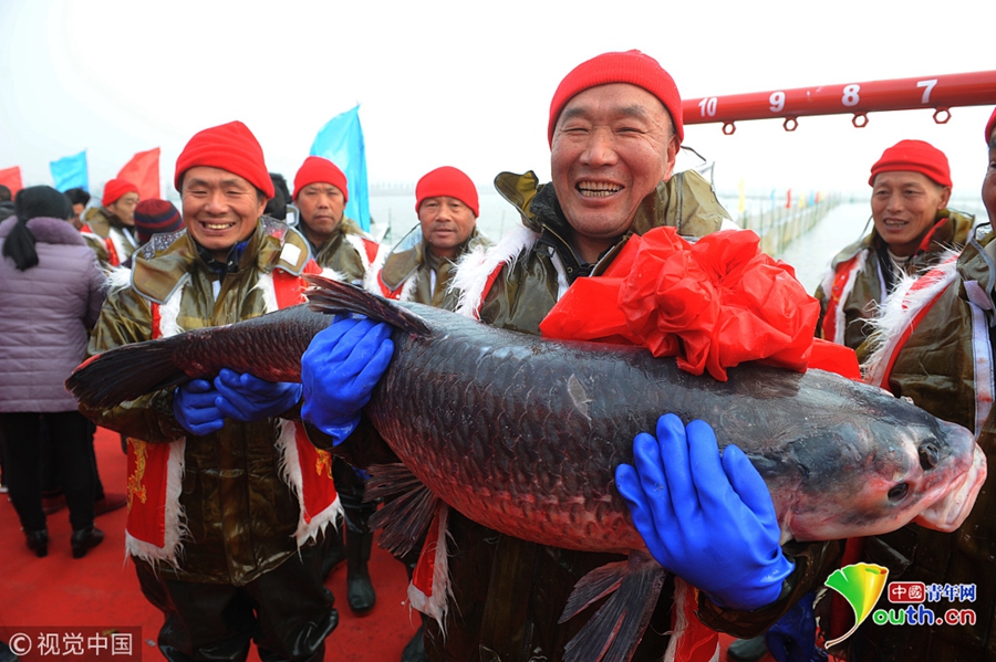 安徽阜陽:八里河冬捕魚“頭魚”拍出88萬元